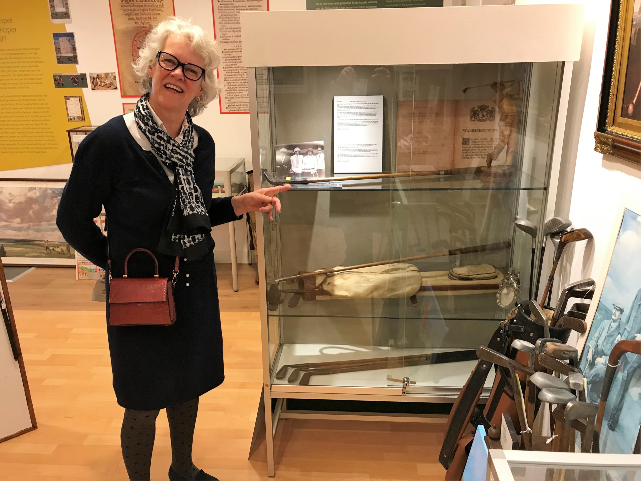 Natürlich bekam Janelle eine umfassende Führung durch das Golfmuseum und sie war sicherlich beeindruckt von dem, was sie sah. Besonderes Augenmerk wurde jedoch auf die spezielle Tasche und den Stick in der Vitrine Del Court van Krimpen gelegt. Aalbrecht Del Court van Krimpen war von 1908 bis 1923 der dritte Vorsitzende des Rosendaelsche Golfclubs.
