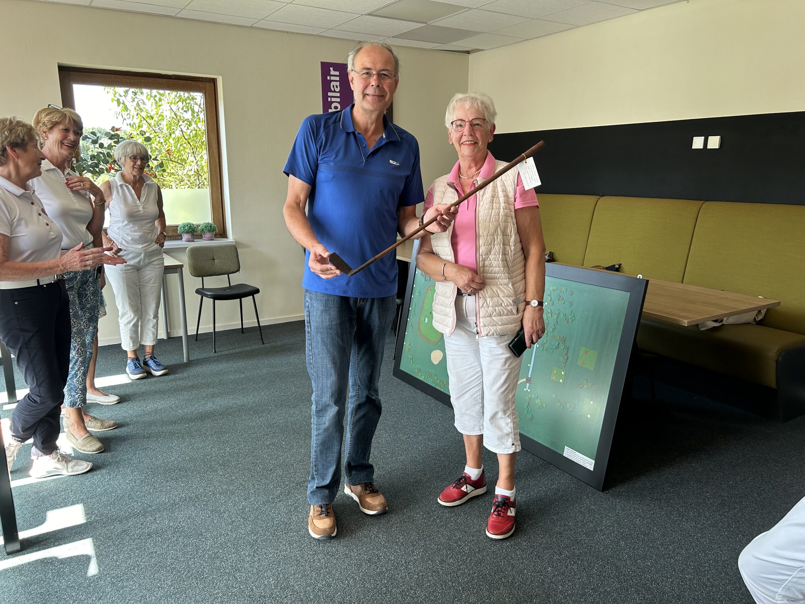 Zes dames van De Verwaeyde Sandbergen waren aanwezig toen het Leskleed Golfregels overhandigd werd aan Jacques Schuiling, secretaris van het Nederlands Golfmuseum. Het Leskleed Golfregels geeft een golfhole weer op een wandkleed, met de verschillende kleuren afslagplekken, de verschillende hindernissen door de baan heen als bunkers en out-of-bounds palen, tot en met zelfs tijdelijk water op de green. Aan de hand van dit leskleed werd door de regeldeskundige uitgelegd hoe de golfer in welke situatie hiermee om diende te gaan. Wij gaan er een mooi plekje voor zoeken in het golfmuseum !