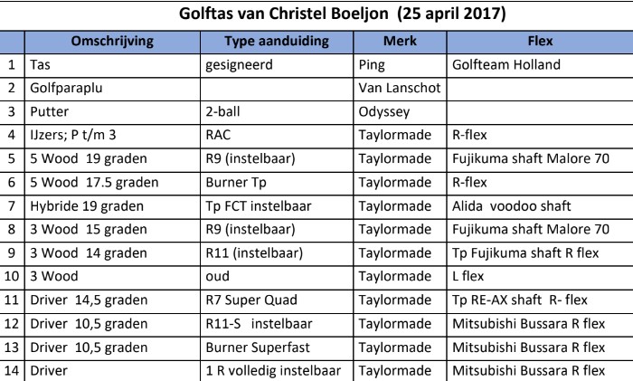 Christel donated this bag with contents to GvoorG in 2017 to help people with disabilities get started in golf. However, the quality of the golf clubs turned out to be too specialized for most golfers with a disability and the golf bag with content seemed to end up in oblivion.