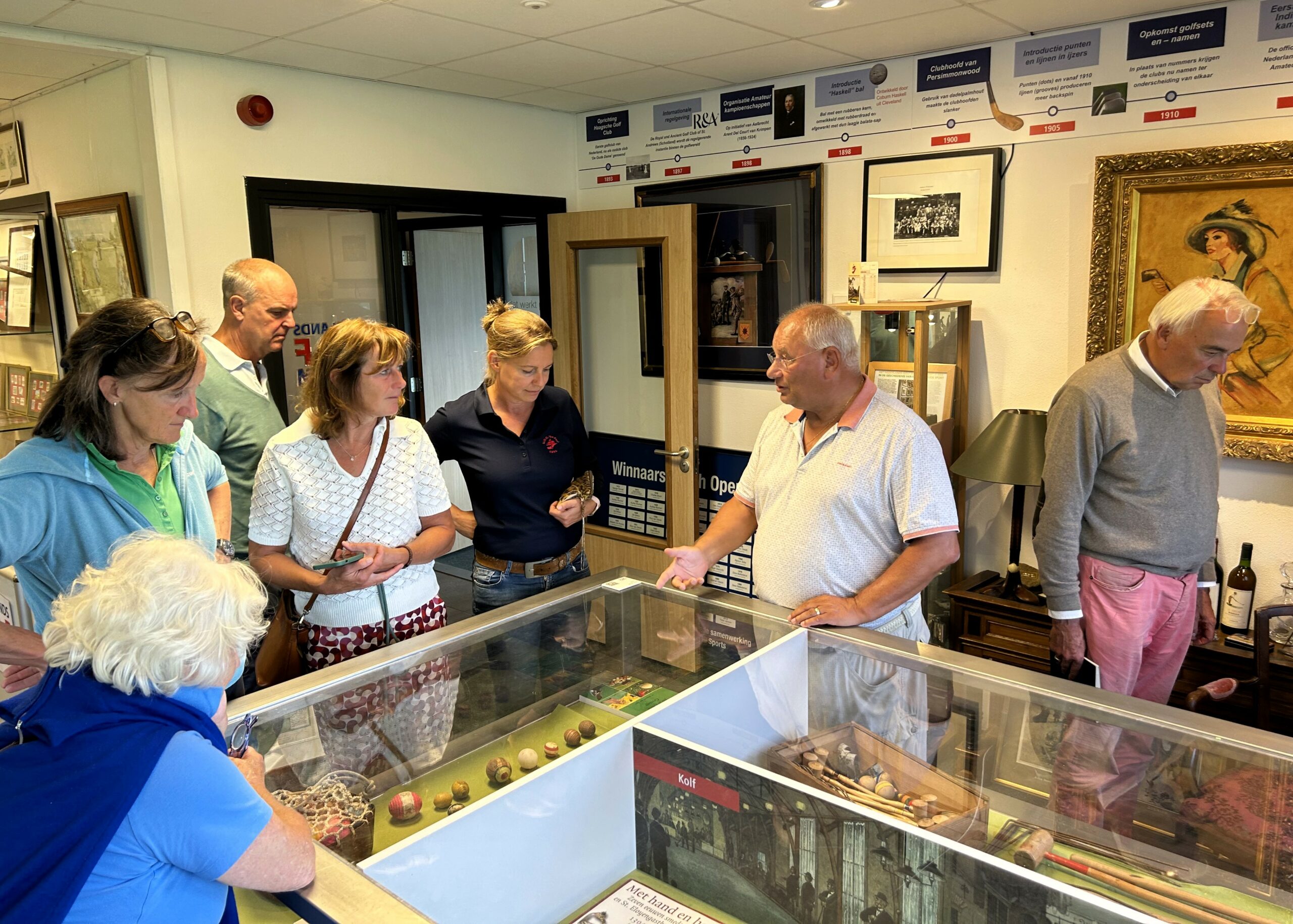 The six-man editorial team was welcomed by board members Ferd and Jacques and listened fascinated to Ferd’s stories during the tour. There were plenty of landmarks for the members of De Pan. Such as the Wall of Fame, the Shield Board of the Dutch Golf Committee, the jubilee books of De Pan 95 years and 115 years. And what do you think of the collection of postcards that former De Pan chairman Calkoen van Limmen received (at his request) from the youth members about their golf activities during the holidays. But the most recognition went to the Aleid Kemper corner in the golf museum, the tribute to the NGF rules expert and member of golf club De Pan.