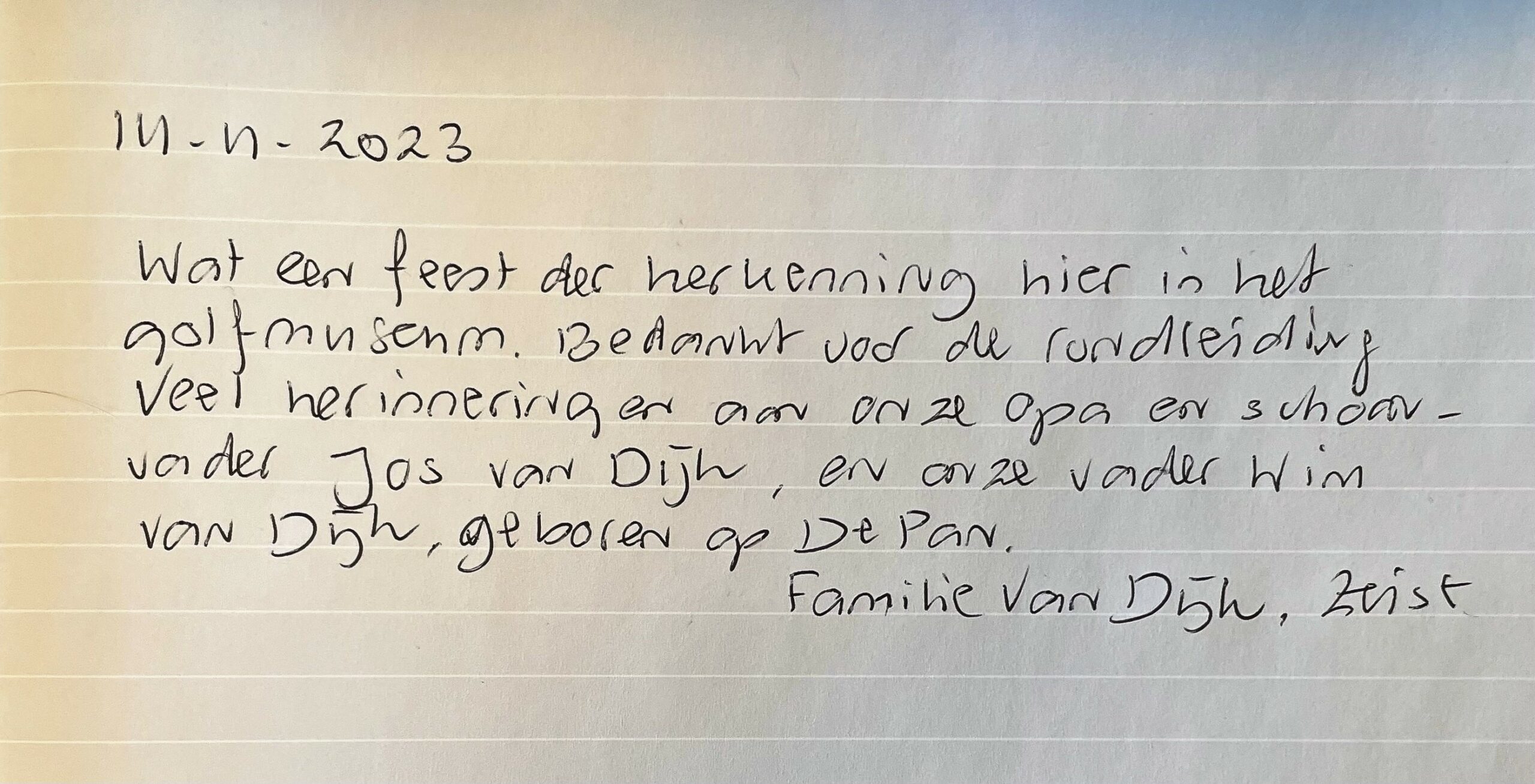 De familie van Dijk toonde zich onder de indruk van het golfmuseum, zowel van de ontvangst als van de collectie, waarbij vele herinneringen bovenkwamen. Herinneringen niet alleen aan Jos, maar ook aan diens zoon Wim, de man van Lies, die geboren was in het clubhuis van de Pan. Ook de in het golfmuseum aanwezige Aleid Kemper-hoek gaf een blije herkenning van een prominent lid van de Utrechtse Golfclub de Pan.