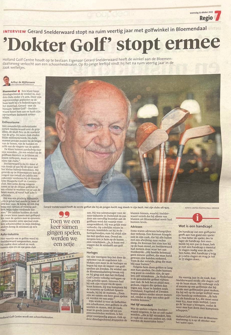 Gerard Snelderwaard (84 jaar) is nog steeds een fanatieke golfspeler. Hij heeft meer dan veertig jaar in de golfsector gewerkt, onder andere als eigenaar van een golfwinkel in Bloemendaal en (nog steeds) als golfer met handicap 12,3 bij Golfclub Houtrak.