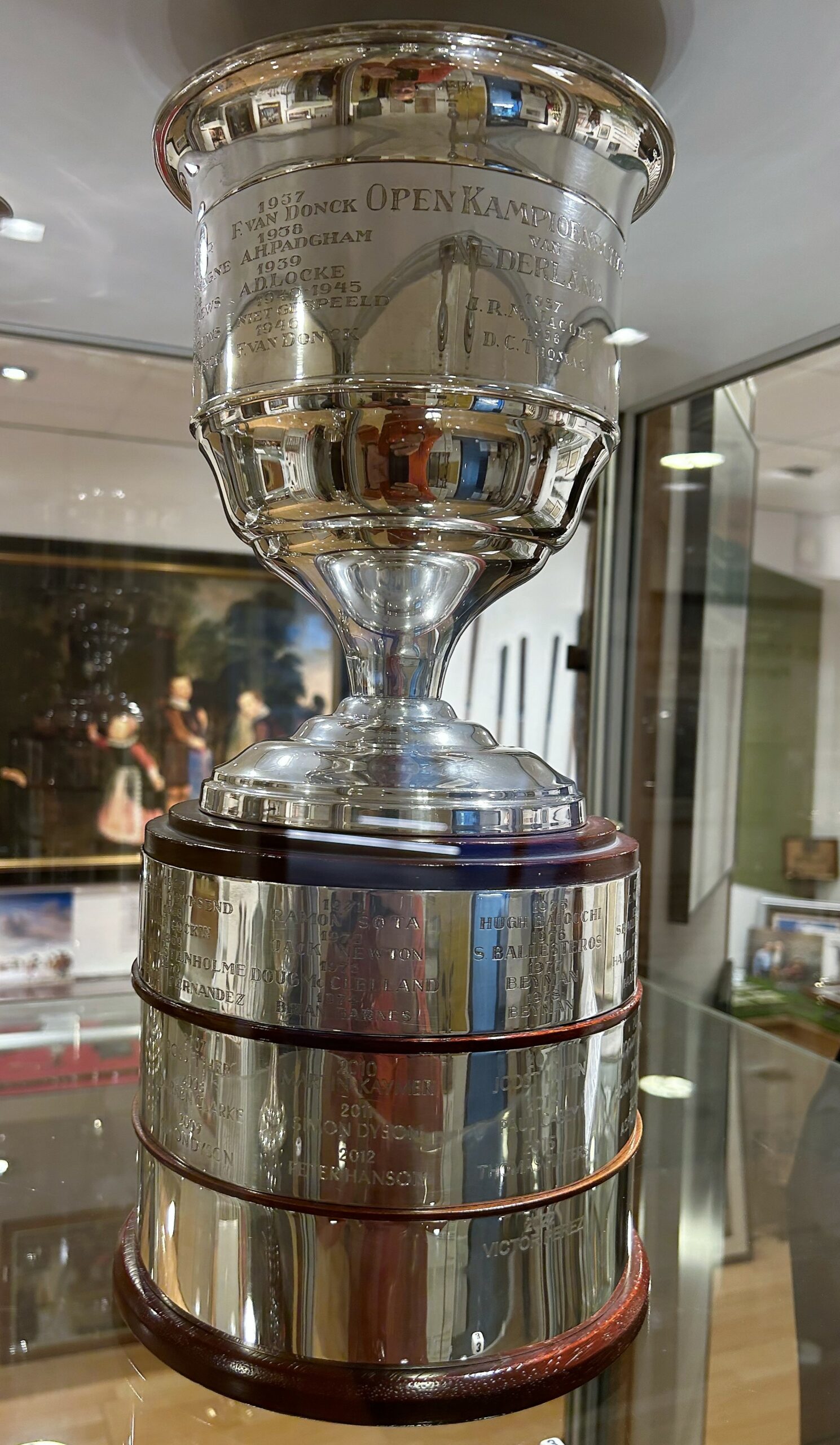 Nadat Victor Perez vorig jaar het Dutch Open won was er geen plek meer op de wisselbeker. De oplossing was een verhoging van de houten voet, waarop vervolgens een derde ring kon worden geplaatst (zie foto links). Hierdoor is er voor de komende decennia plek genoeg voor de toekomstige winnaars van deze DP World Tour wedstrijd.