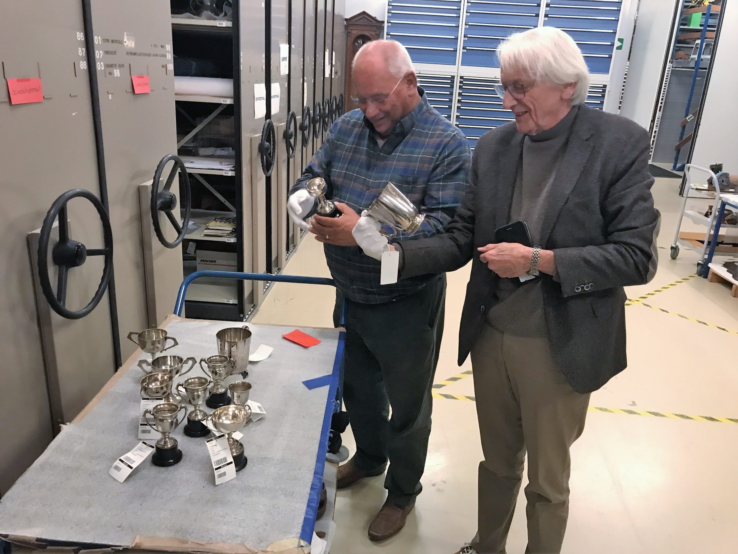 Tijdens het gesprek worden we meegenomen naar het Depot van Museon-Omniversum, waar de golfbekers zich bevinden. Een leuke ervaring, want bij een normaal museumbezoek zijn deze ruimte verboden voor het publiek.