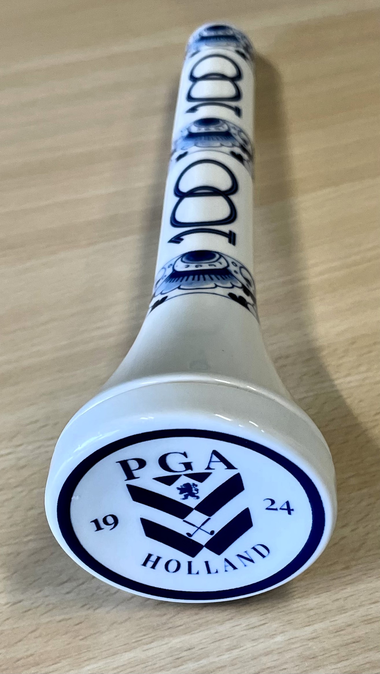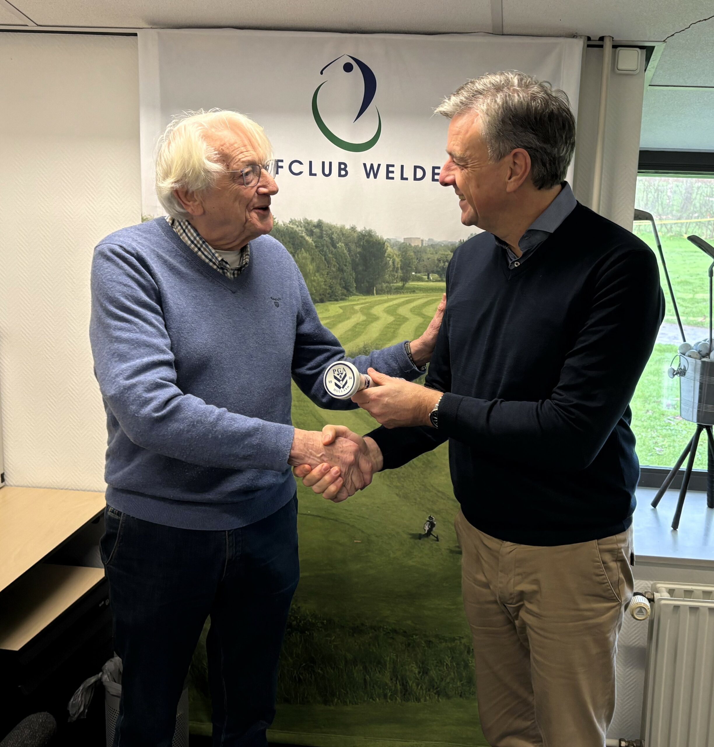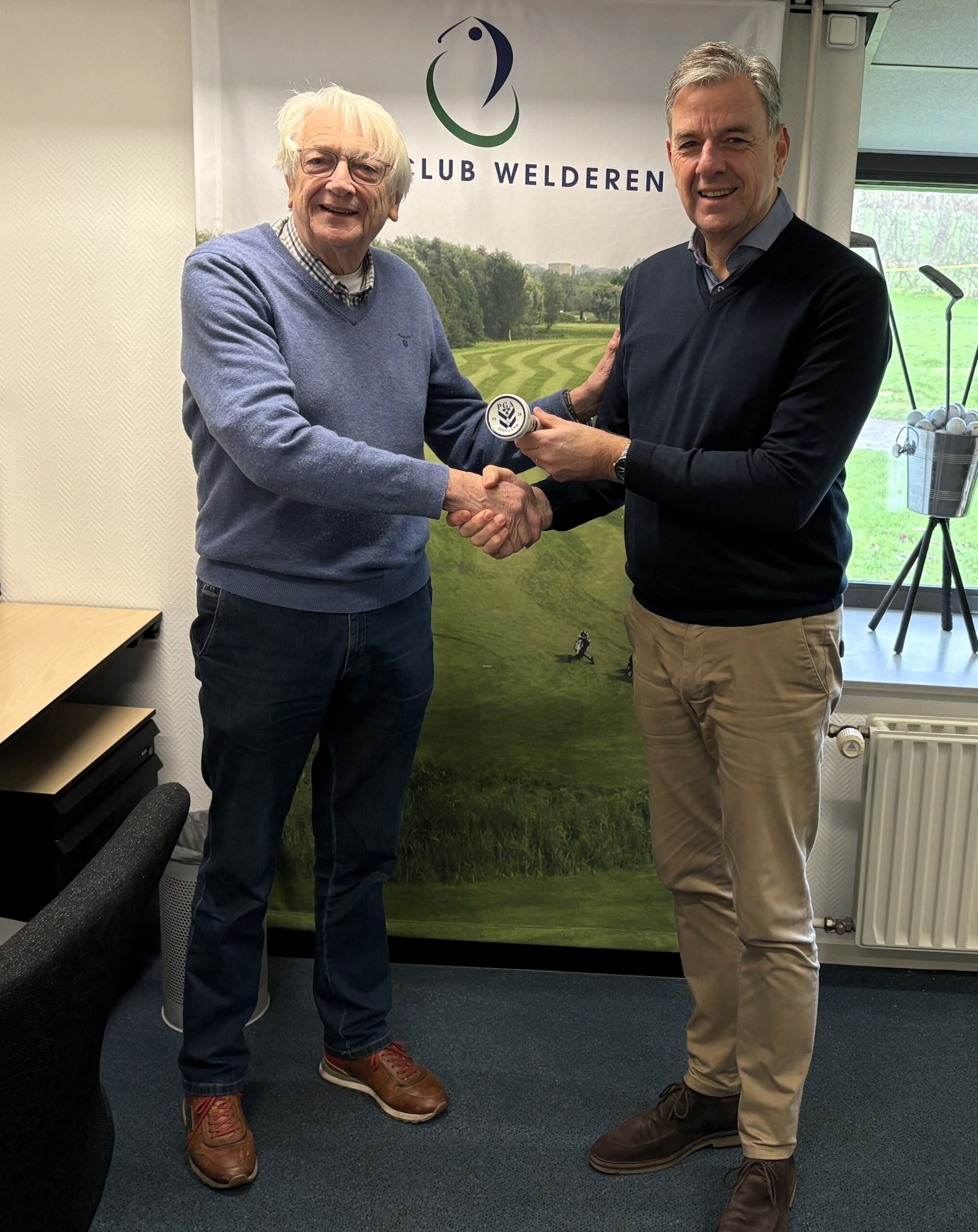 Jan was hier heel blij mee, maar vond dat dit fraaie exemplaar beter tot zijn recht kwam in het golfmuseum. En zo is de 100-jaar PGA Holland Tee voor iedereen te bewonderen in het Nederlands Golfmuseum.