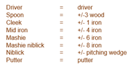 Het vergt enige oefening, maar het is een bijzondere ervaring. Ter vergelijking met de moderne golfclubs: een Driver blijft een driver, een Spoon is een houten 3, een Cleek is een ijzer 1, een Mid iron is een ijzer 4, een Mashie is een ijzer 6, een Mashie niblick is een ijzer 8, een Niblick is een (pitching) wedge en een Putter blijft een putter. Zo ongeveer dan.